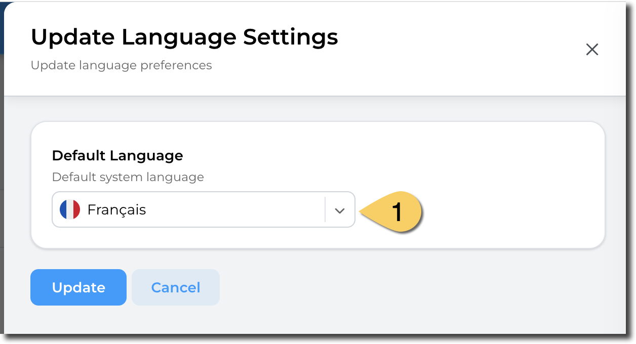 To change the default language of your Sandbox Studio installation, go to "Settings" > "Display Settings" (1) and click on "Update" in the "Language Settings" section (2):
