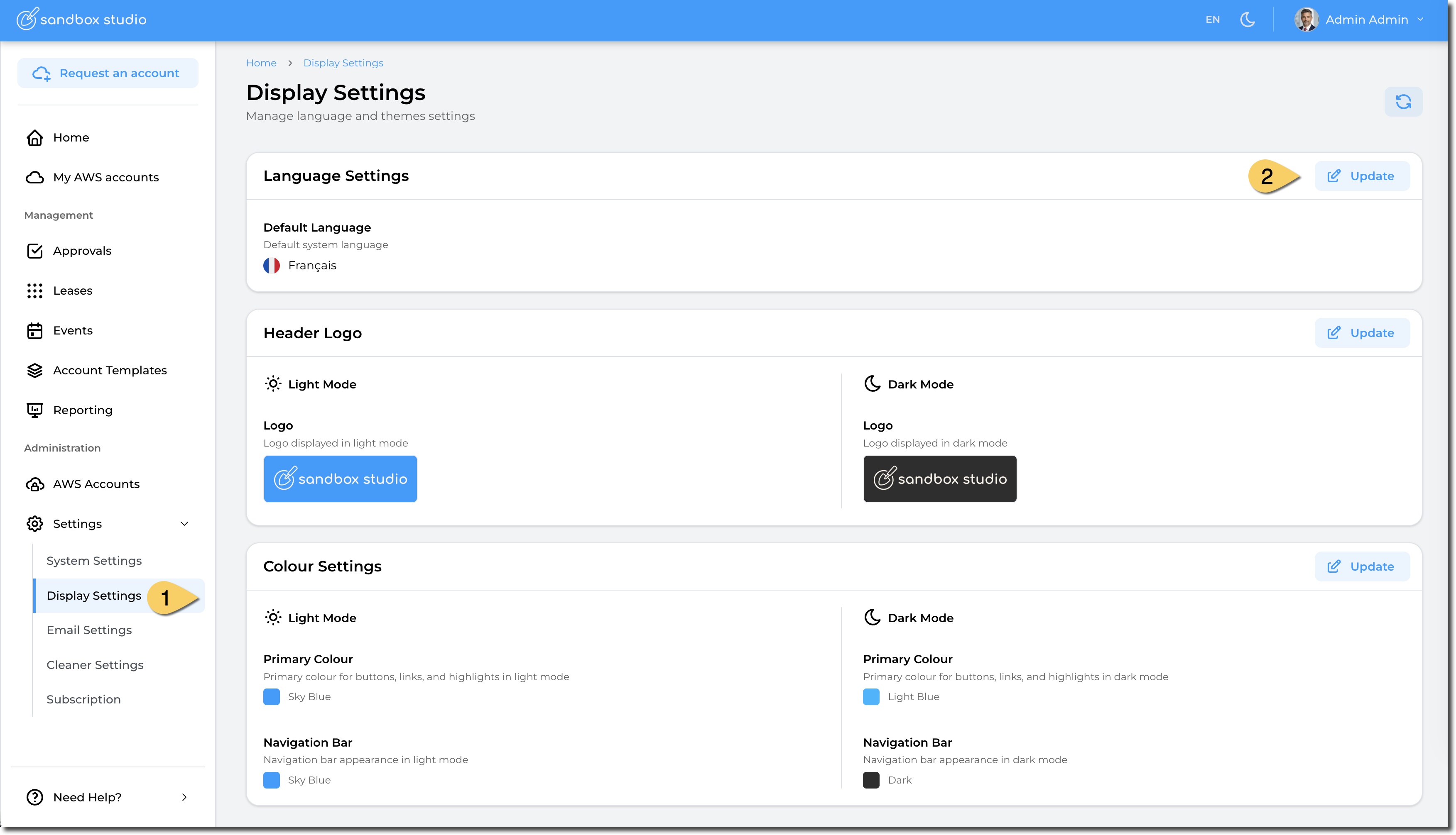 To change the default language of your Sandbox Studio installation, go to "Settings" > "Display Settings" (1) and click on "Update" in the "Language Settings" section (2):