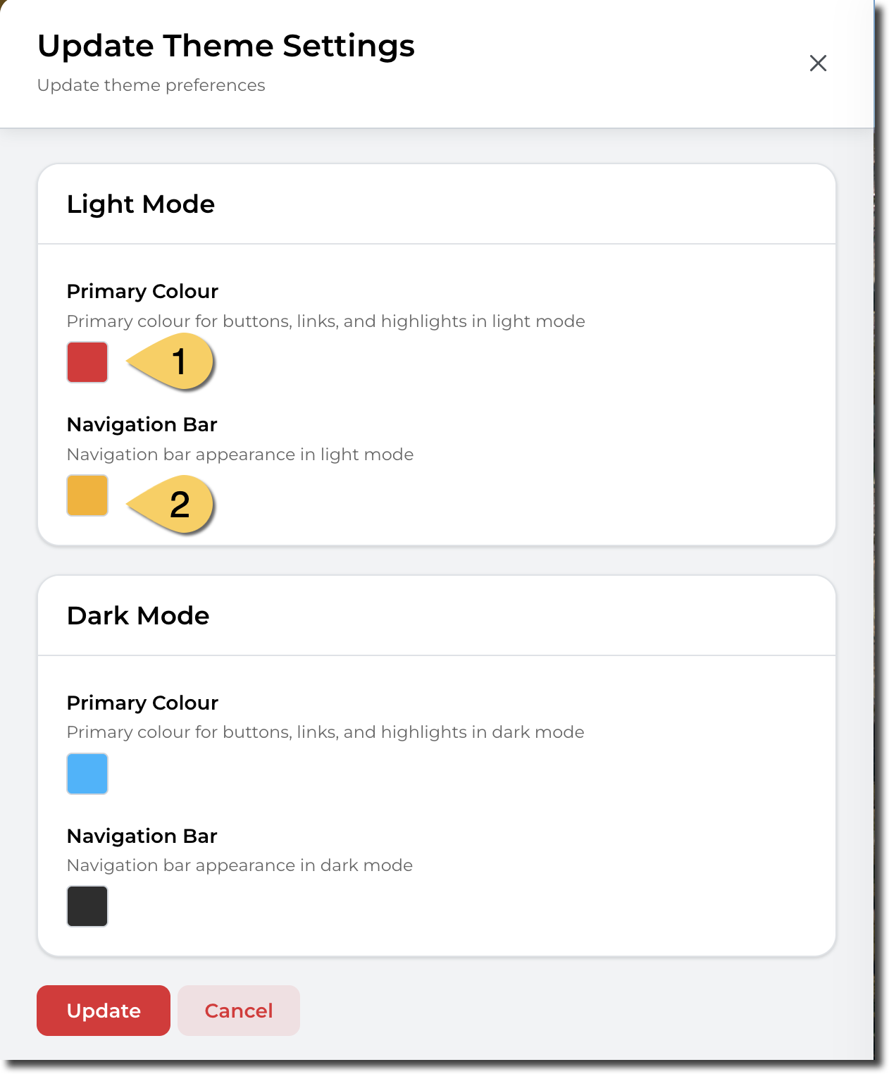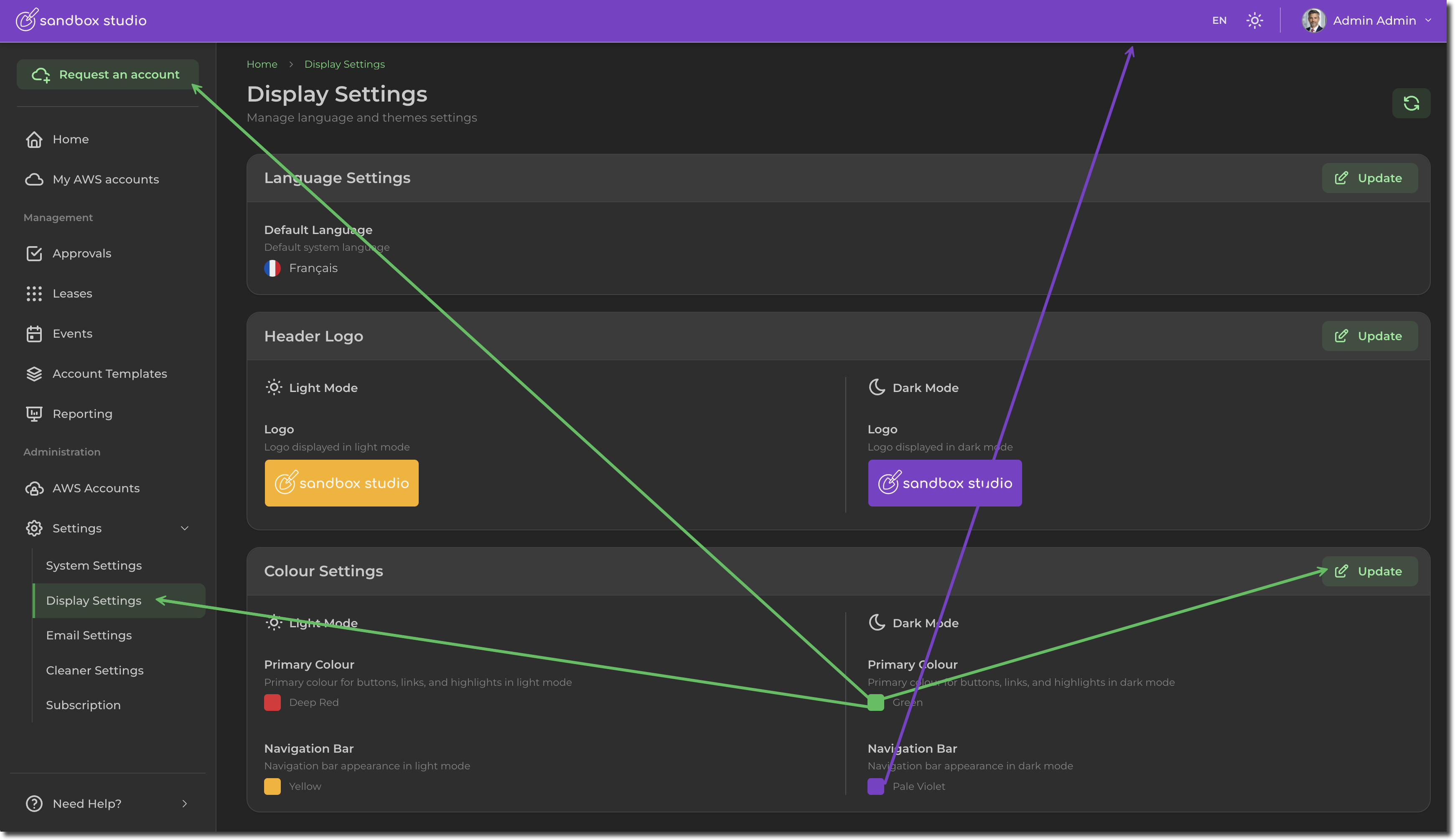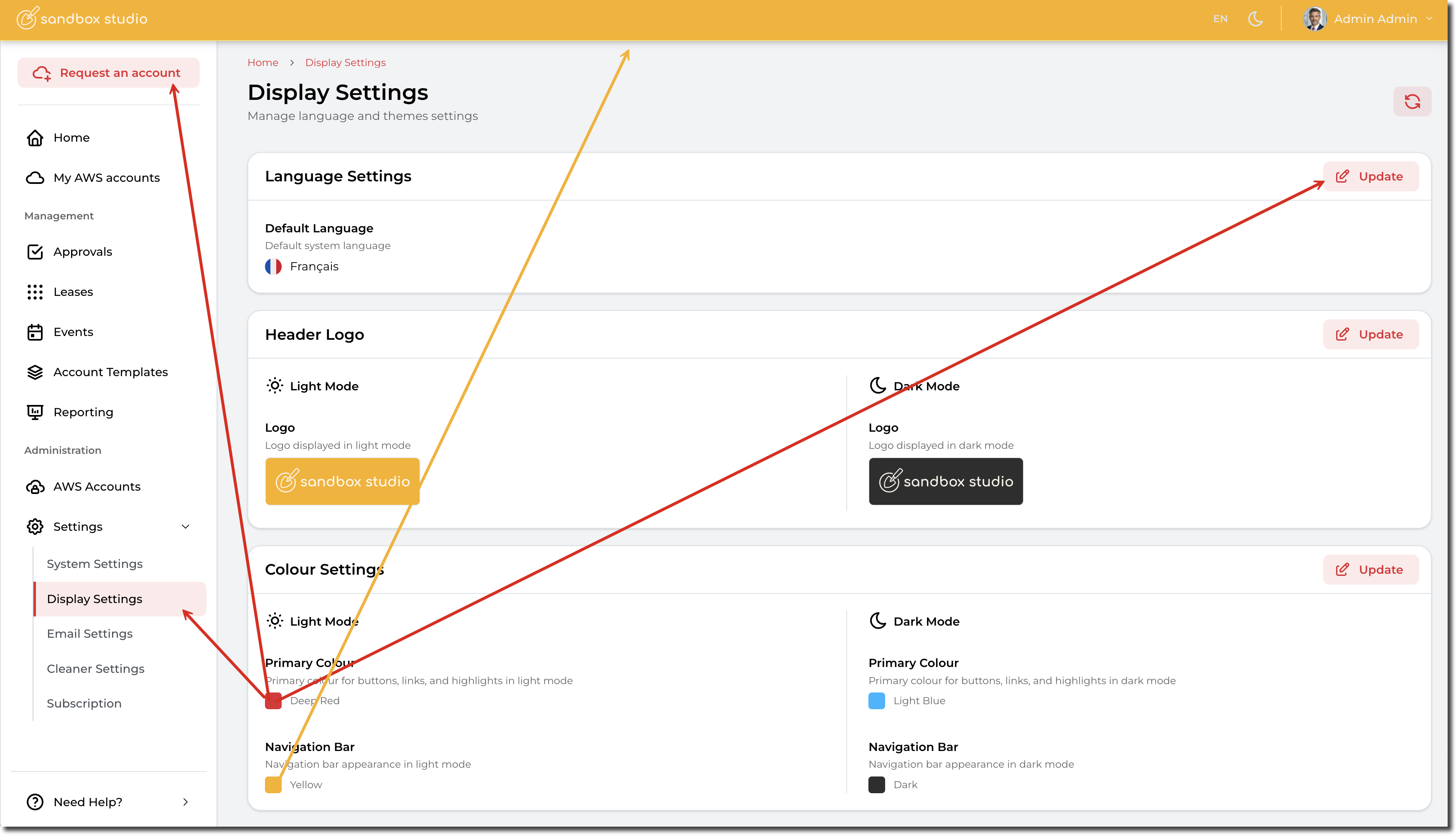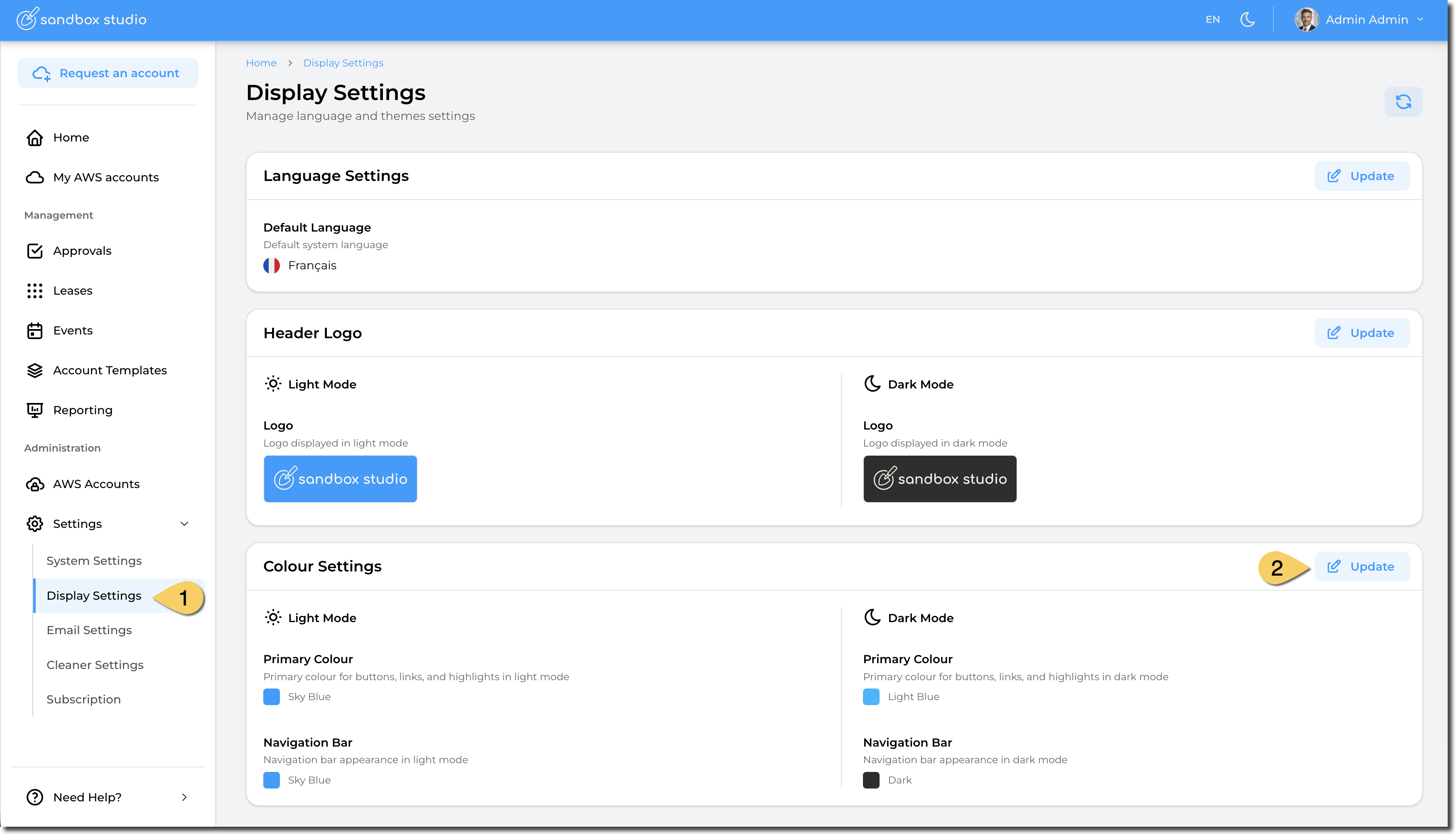 To change the theme colour of your Sandbox Studio installation, go to "Settings" > "Display Settings" (1) and click on "Update" in the "Colour Settings" section (2):