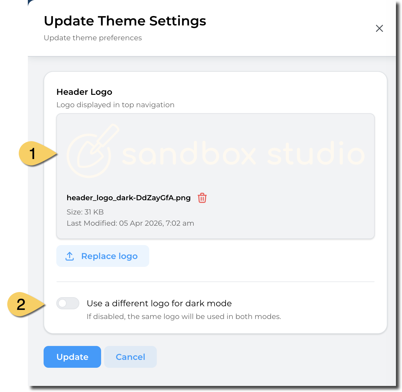 - You can choose to have a different logo for dark mode. If this option is left unticked, the same logo as the first one is used.