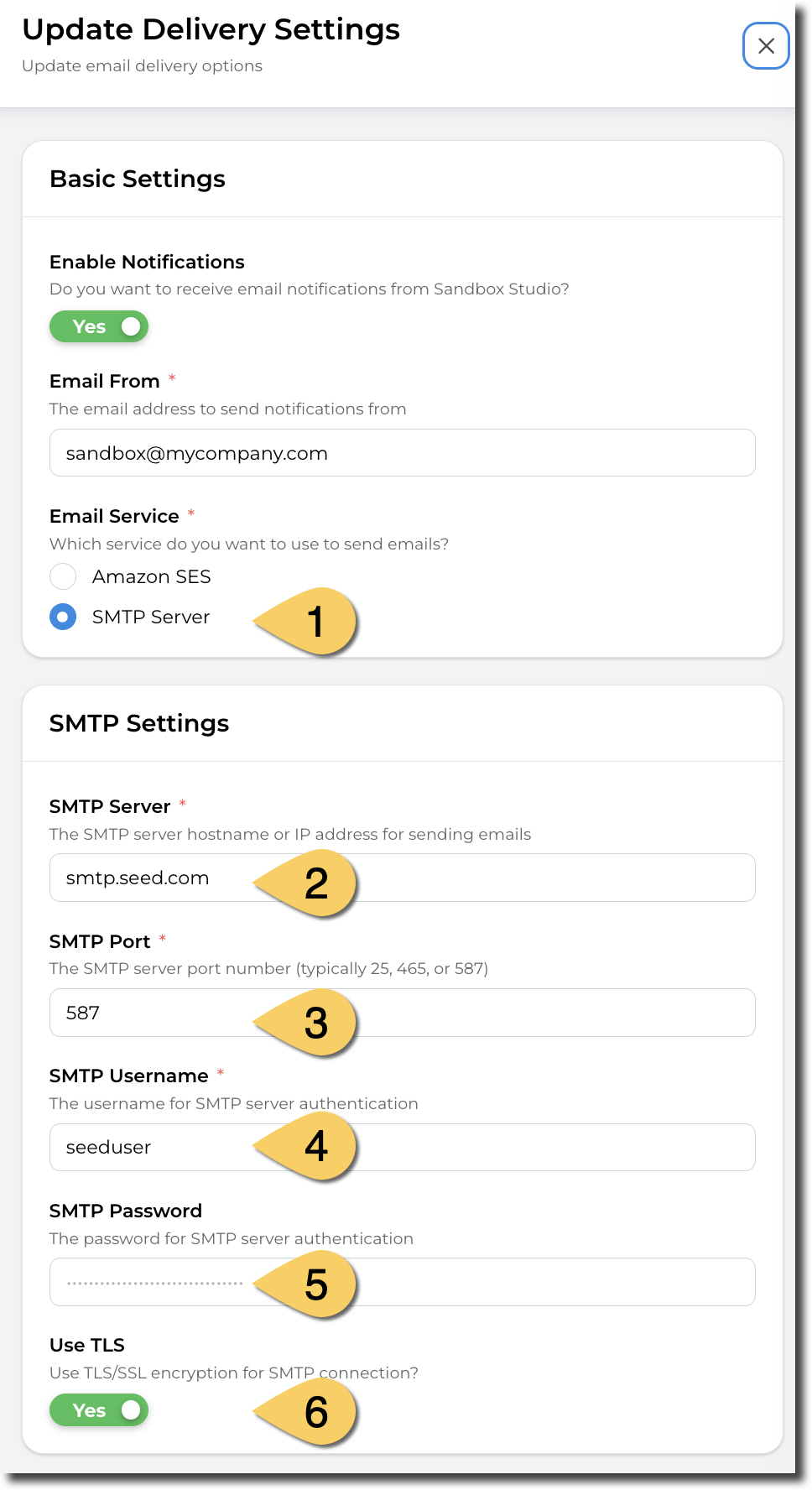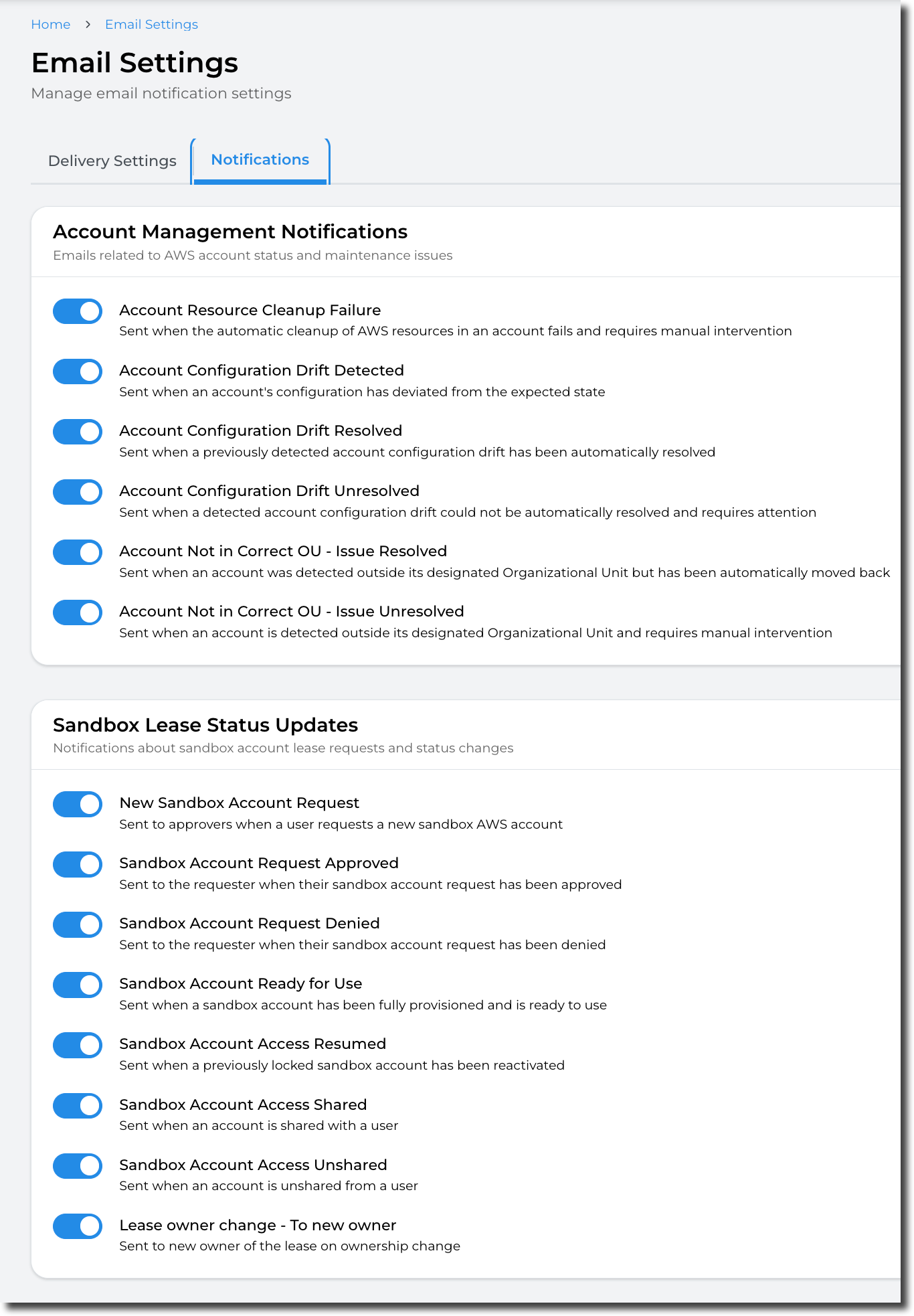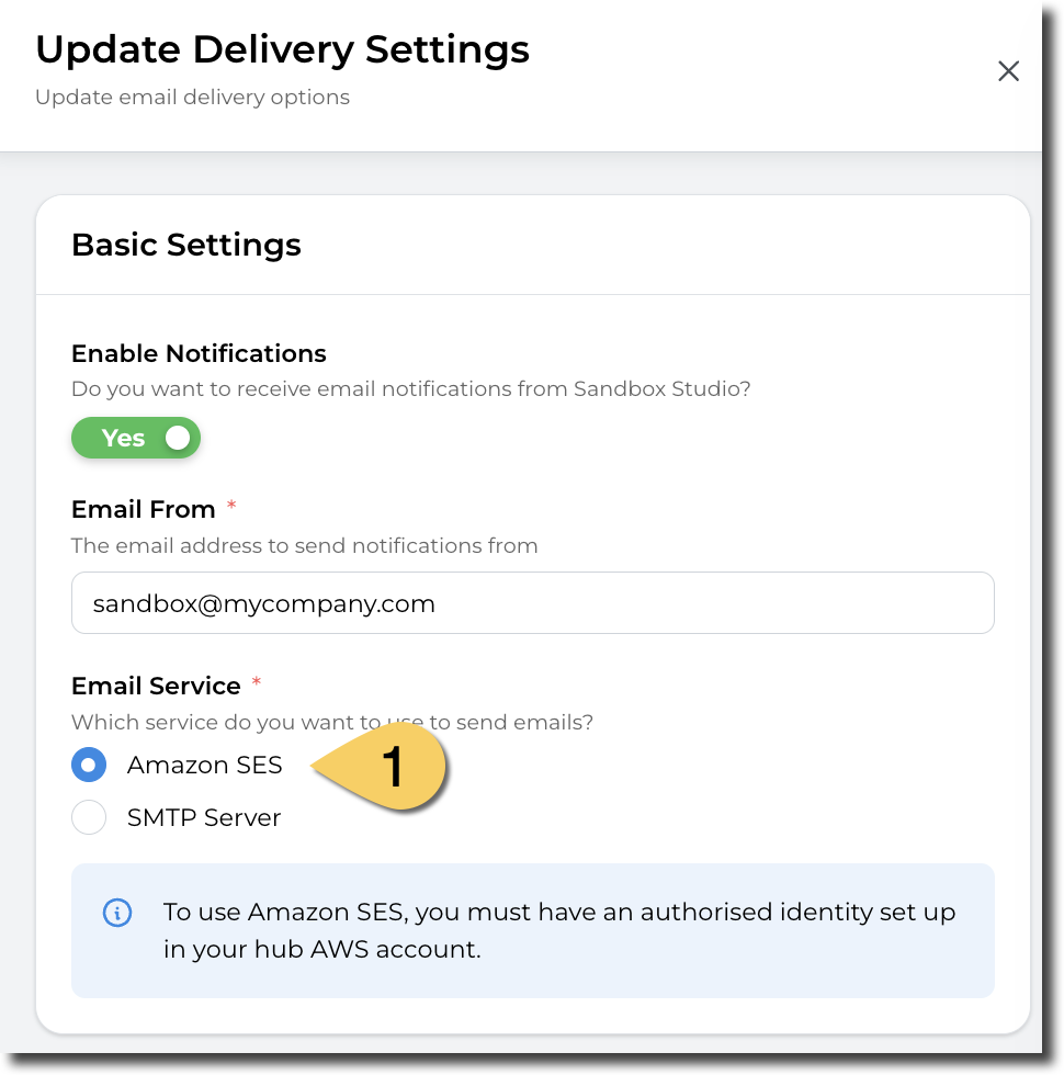 - Delivery Settings: Allows to configure how emails are sent, either through Amazon Simple Email Service (SES) or through a standard SMTP server.