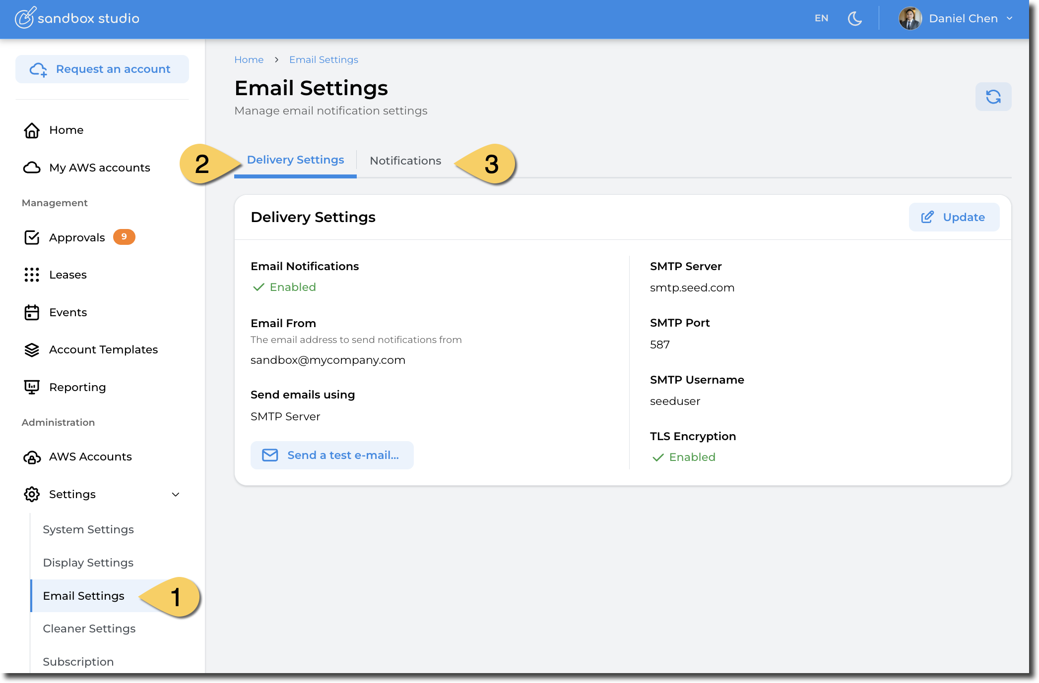 - Notifications: Allows to select what notifications are sent to users, managers or approvers. In the current version of Sandbox Studio, this settings applies for all users.