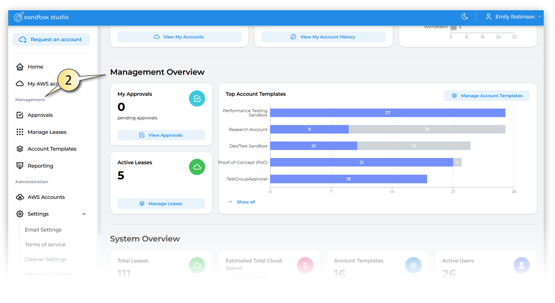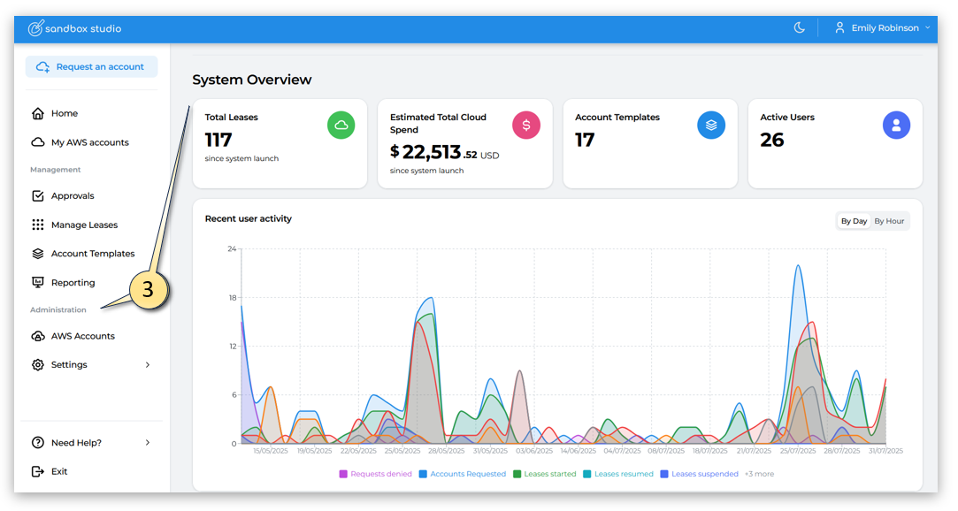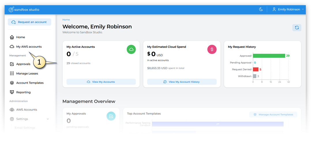 As a Sandbox Studio Administrator, you have the capability of requesting and accessing AWS Accounts yourself, overseeing the end user accounts as a manager would, as well as the global overview of your entire AWS Sandbox environment.