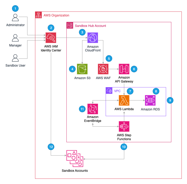 - AWS Step Functions coordinate the lifecycle of sandbox accounts, including: