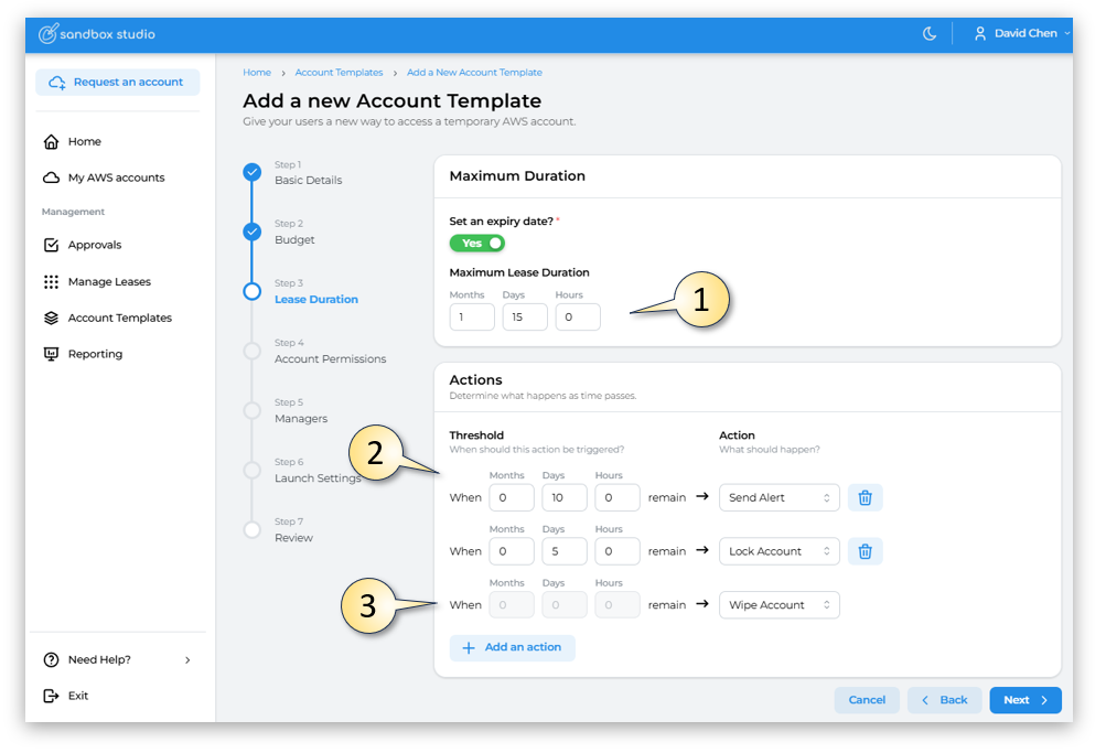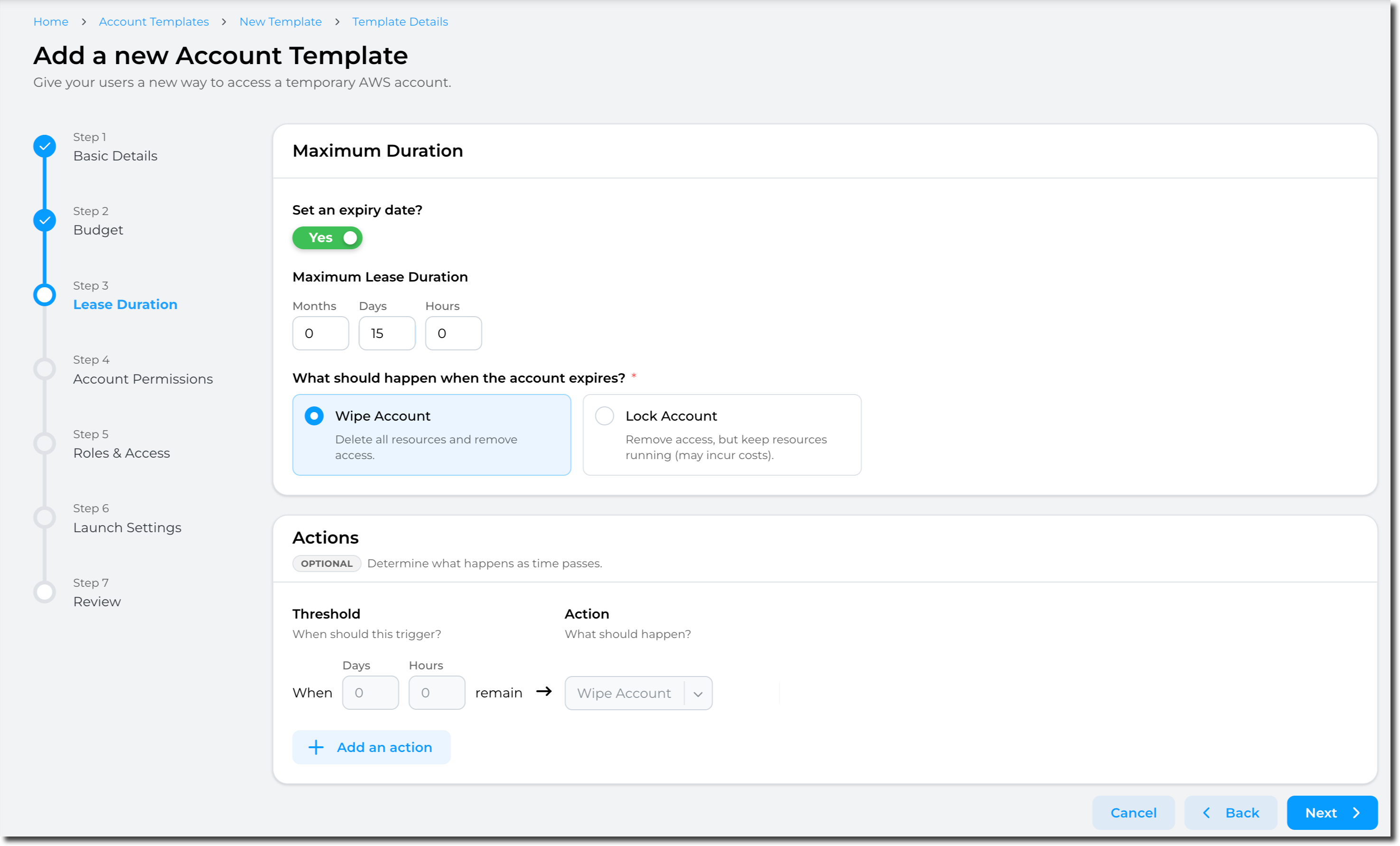 - In this example, an alert is sent when 10 Days (2) are left on the lease. It gives the user time to save their work if they want or ask for an extension. Then at 5 Days to go, it locks the account, and only when the lease reaches zero ( 0 , 0 , 0 ) time to go (3), will the account Wipe (terminate) and recycle through the clean-up process.