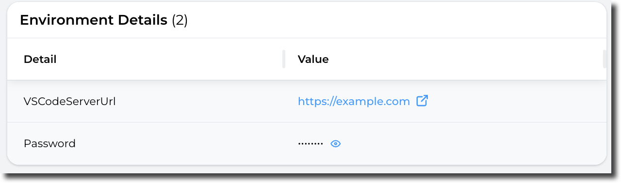 Sandbox Studio allows you to display environment details from the launch template script. You can, for example, return URLs, passwords, environment variables, etc.