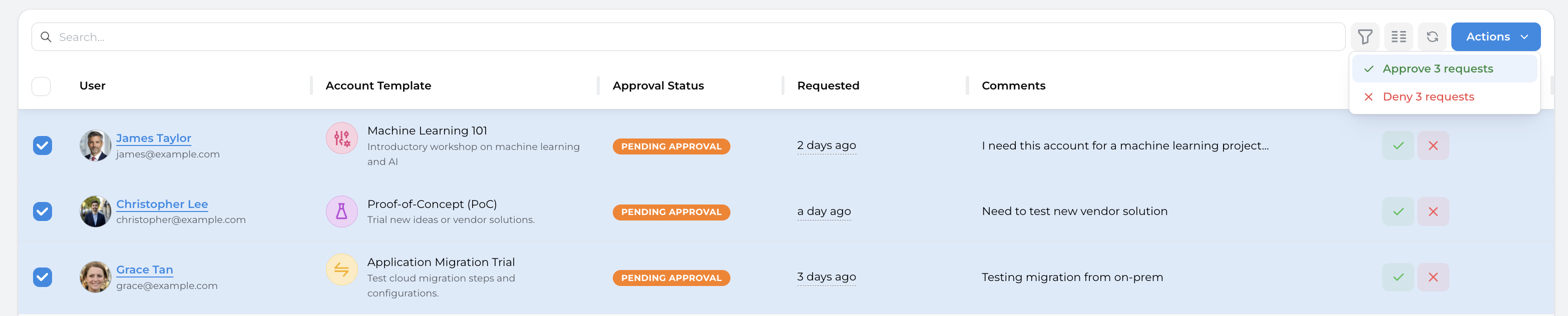 When setting up the Account Templates, the Manager or Admins can set an account to require approval, before it is issued to a user. When a user requests such an account, Managers or Admins need to approve the request for the user to be granted access to the lease.