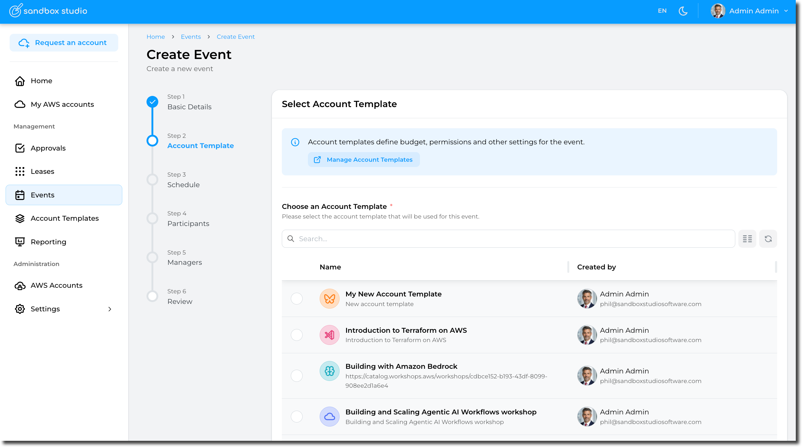 Having selected the account template, click on Next to move to Event creation - Schedule