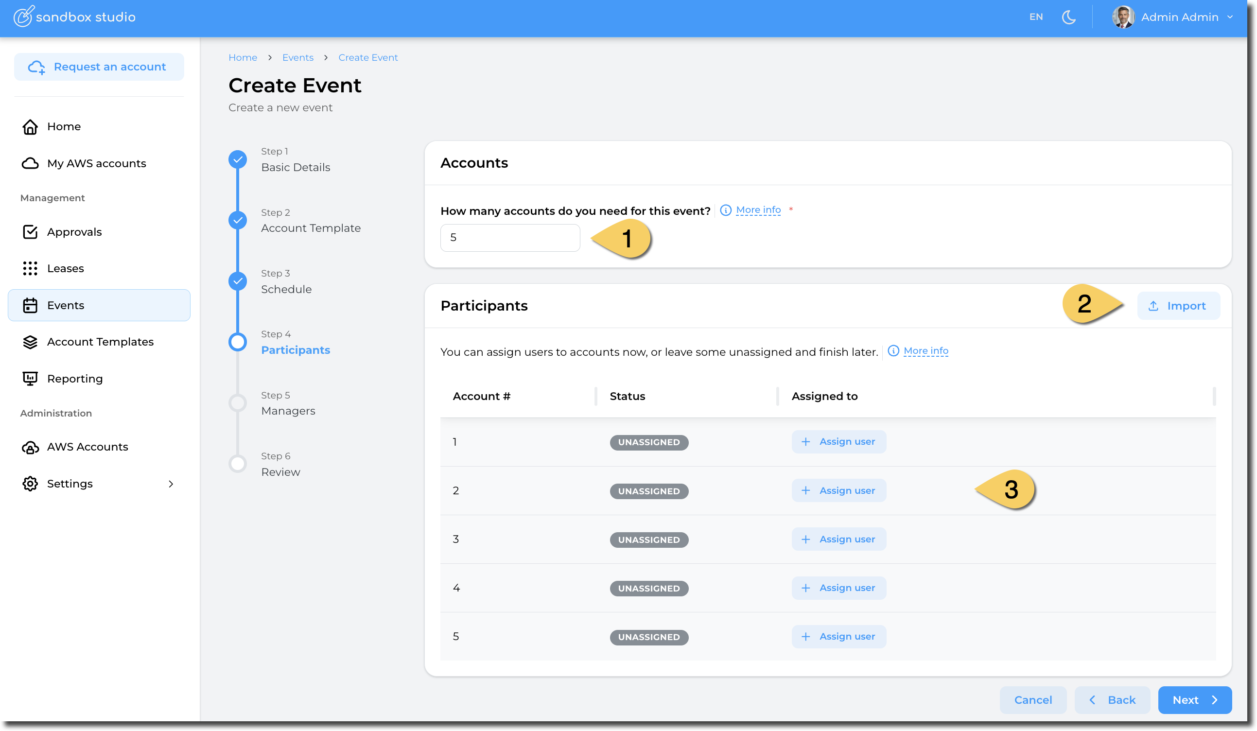 This step allows you to define how many accounts (leases) you want to have as part of your event.