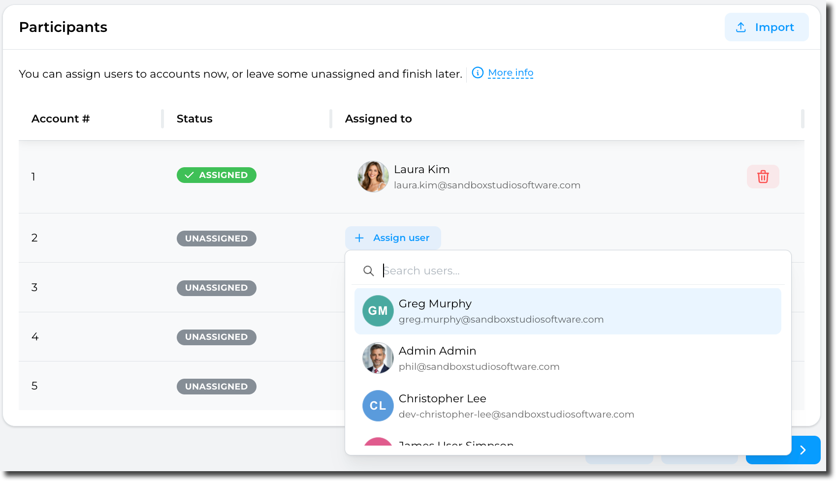 Click on the "Assign user" button and select the user you want to assign to an account. Once assigned, the status becomes "Assigned"