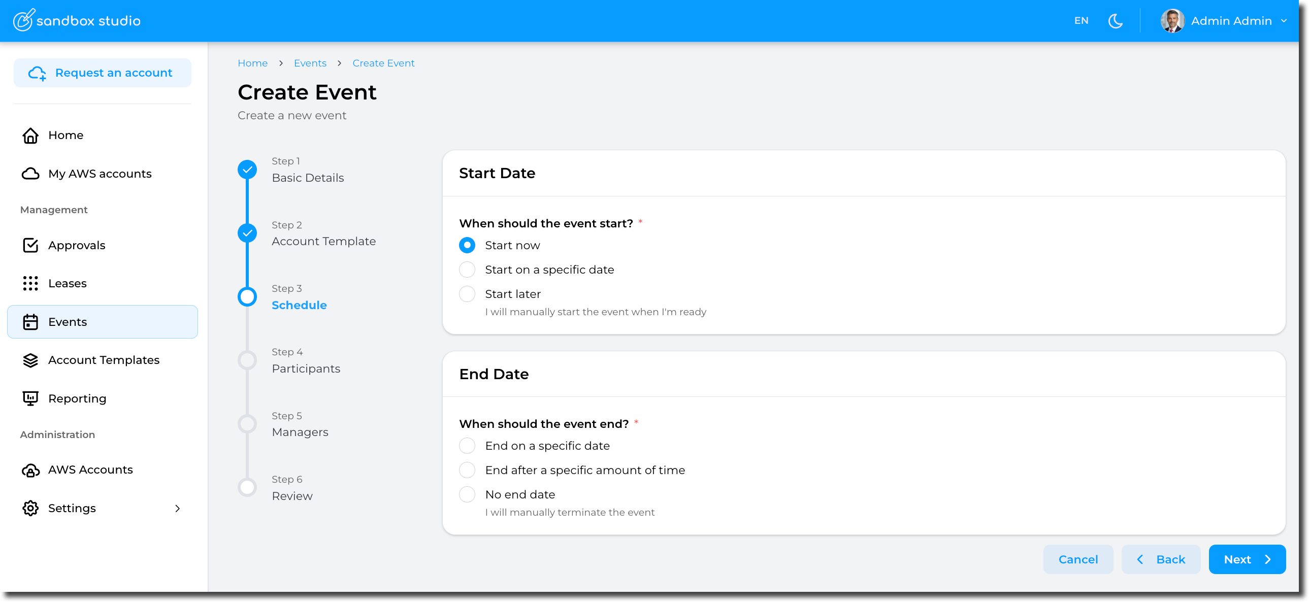 - Pros: "Set and forget", the event will automatically start at the date/time of your choice. This option also allows you to pre-provision the accounts before the event starts, so you don't have to wait for the resources to be created in the accounts.