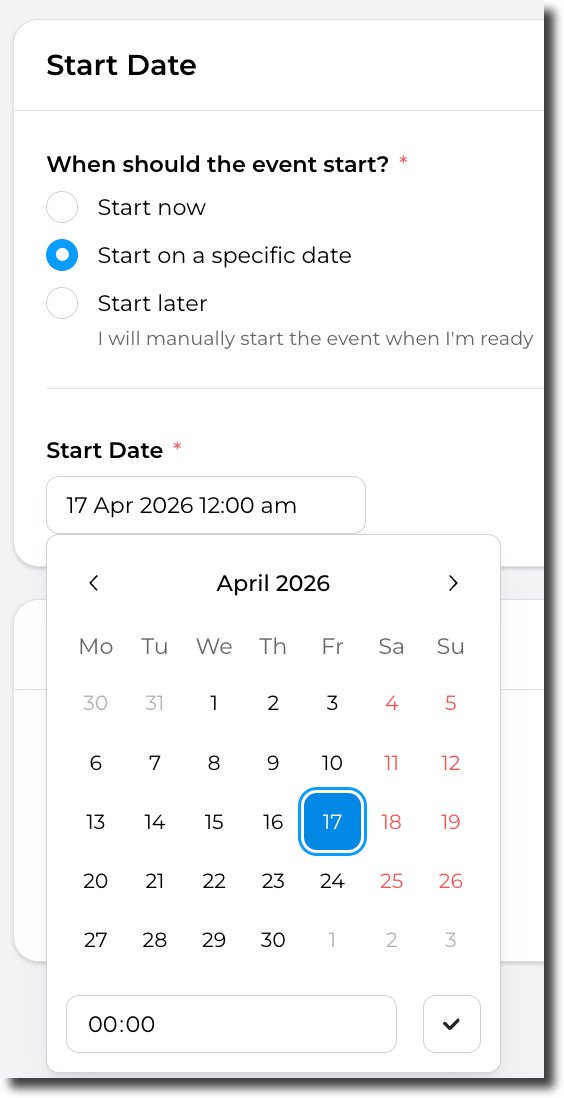 You can set the event to start on a specific date (and time) you define. This is particularly useful is you want to schedule an event to start automatically in the future.