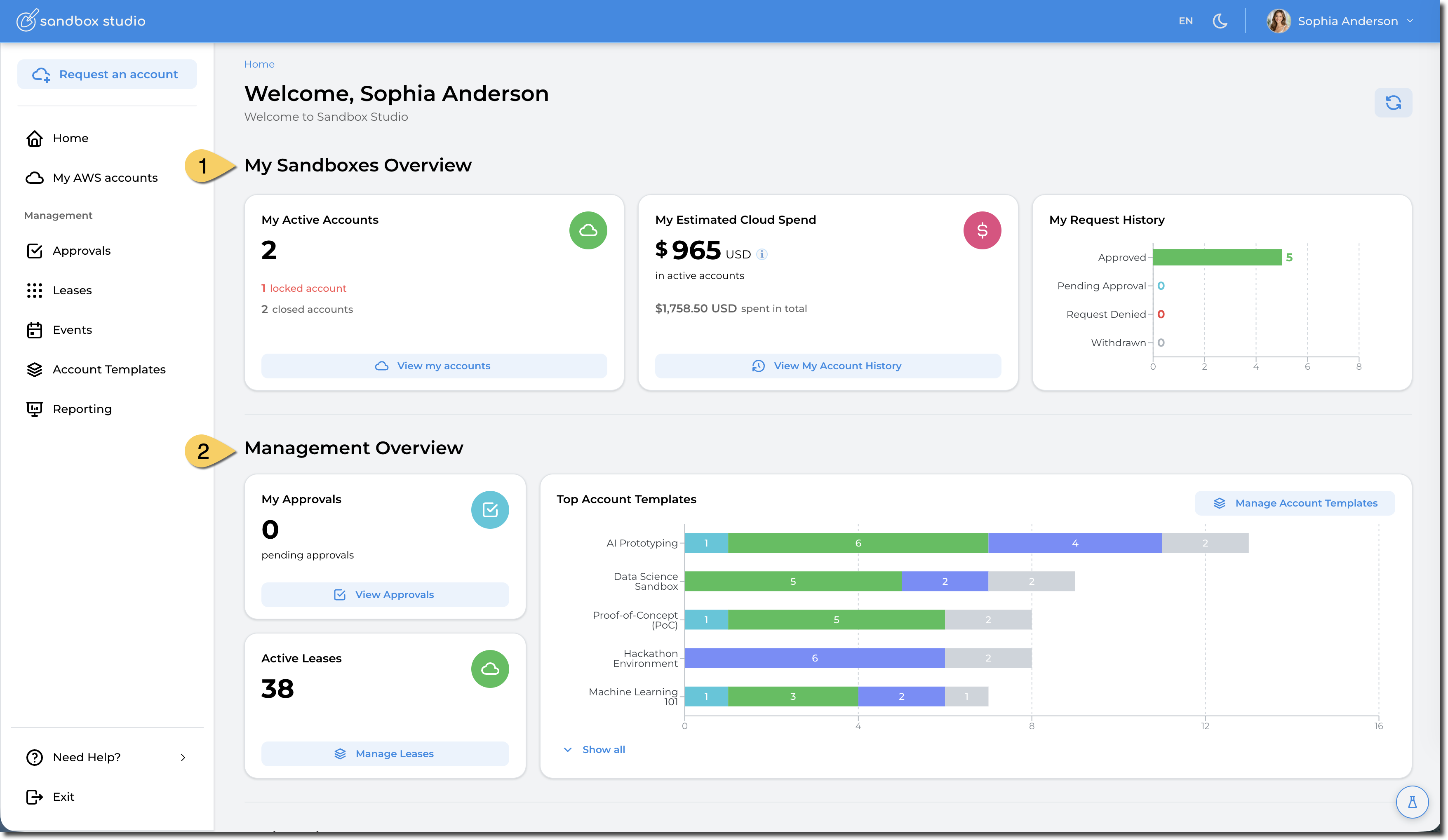 As a Sandbox Studio Manager, you have the dual capability of overseeing the environment for your end users and also requesting and accessing AWS Accounts yourself, just as your end users do.