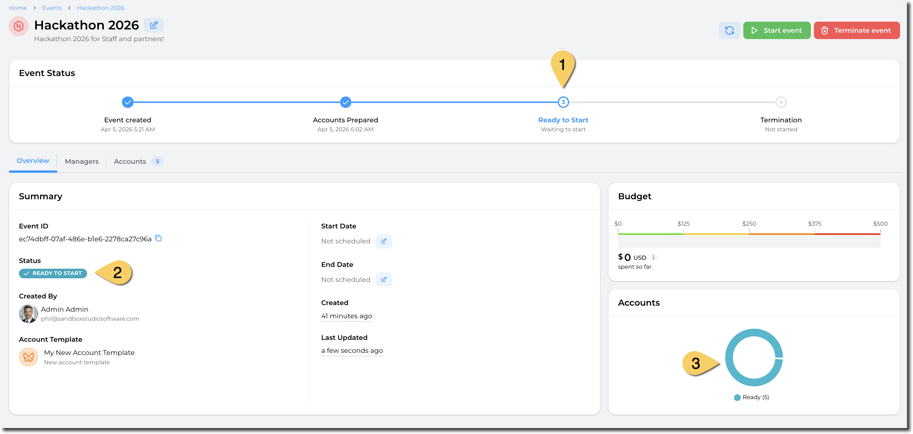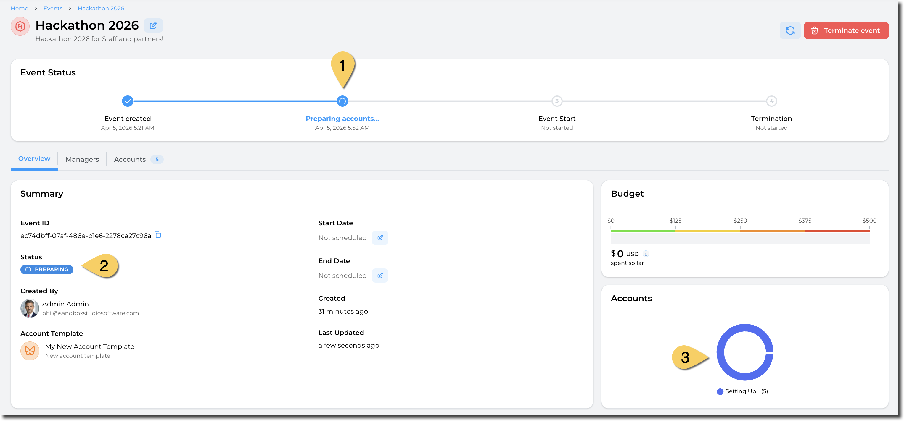 - Account can be provisioned manually before the event or will be automatically provisioned when the event is started.