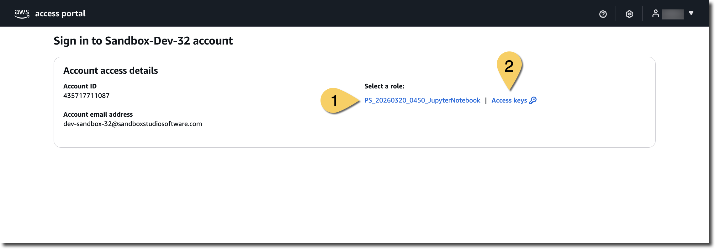 - On the AWS Access portal, the Account access details box, you will find all the available roles that can be used for logging in. You can either: