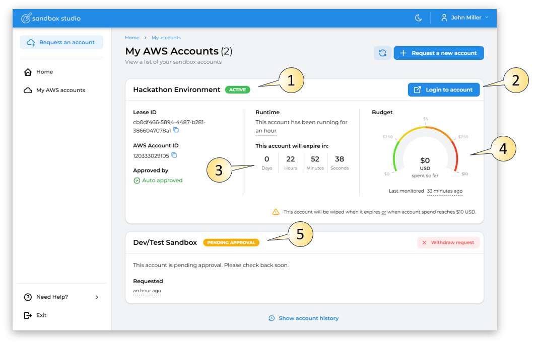 The account is ready to use. You can log in to the AWS console or retrieve temporary credentials from Sandbox Studio. Active accounts remain available until they reach their budget or duration limits, or until they are suspended. -